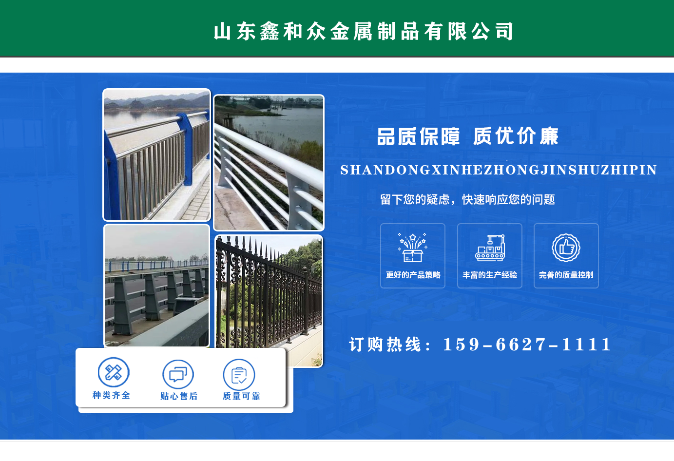 山東鑫和眾金屬制品有限公司主要產(chǎn)品有防撞護欄,橋梁護欄,道路護欄,河道護欄,不銹鋼護欄等護欄。提供設計方案,一站式定制,包您滿意價格優(yōu)惠,歡迎來電咨詢!    公司常年從事銷售護欄防撞護欄,橋梁護欄,道路護欄,河道護欄,不銹鋼護欄,橋梁鋼護欄,河道燈光護欄等。產(chǎn)品廣泛應用于橋梁、河道、旅游景區(qū)、道路、公路、公園、小區(qū)、景觀、道路防撞等領域。    公司產(chǎn)品均采用優(yōu)質(zhì)不銹鋼材料,符合相關標準。各種型號不銹鋼復合管及護欄,質(zhì)量嚴格把控。產(chǎn)品強度高、耐腐蝕、焊接牢固、抗沖擊、性能好,防撞護欄結(jié)構簡單、美觀實用大方。     歡迎前來訂購!...
